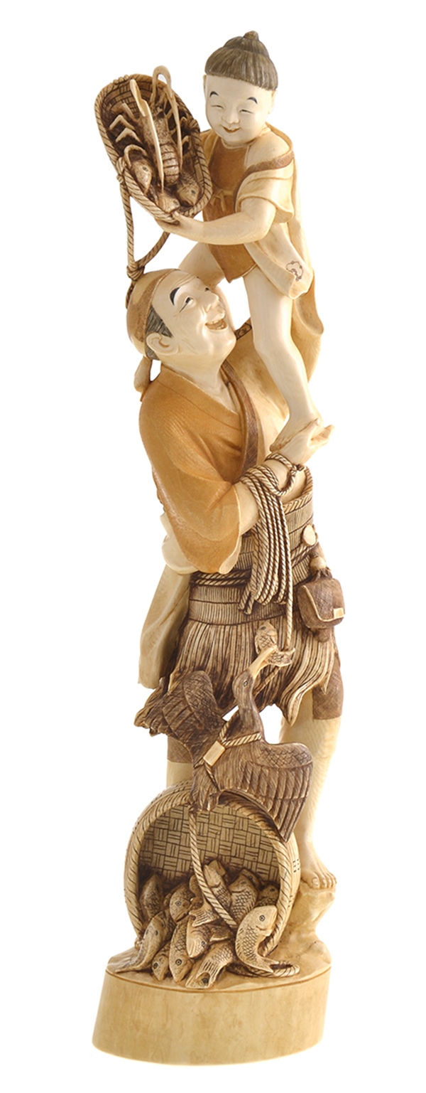 Carved and stained ivory featuring a fisherman holding his son aloft amongst a basket of fish and tethered bird, signed Gyokuho on red inlaid tablet, height 47cm.
