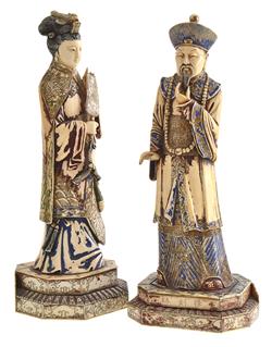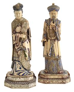 Depicting a Chinese lady and man in court dress, finely painted and positioned on tiered bases. 41cm high.