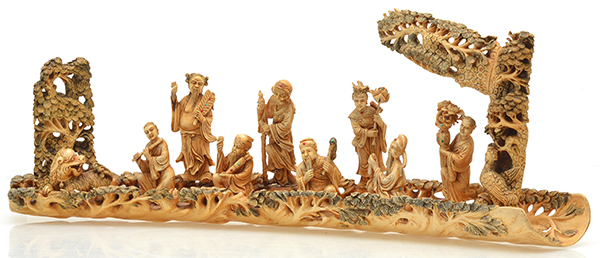 Depicting the eight immortals of Chinese mythology, riding on a hollowed ivory tusk, 165 x 25 x 12cm.