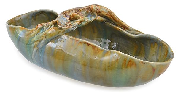 hand-modelled earthenware low sided basket, branched handle upon which a lizard in high relief rests, multi-coloured glaze, inscribed Castle Harris, Sydney to base, 10cm high, 28cm long