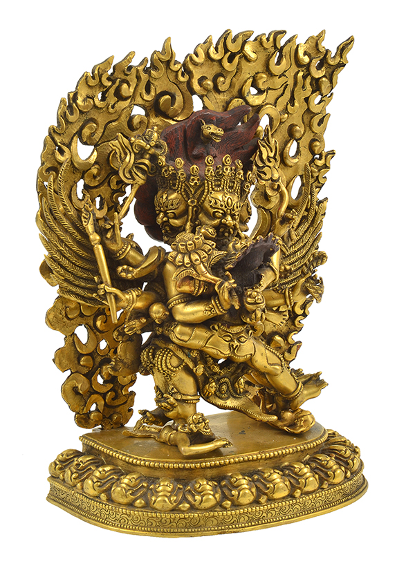 modelled with three fierce faces, six arms each with attributes, four legs, wings, and a skull crown and necklace, standing on a lotus base with two attendants, framed by a flaming mandorla ,24cm tall x 16cm wide