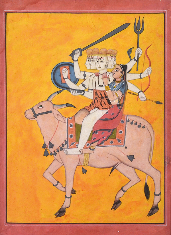 depicting a five headed Shiva as a warrior riding a cow with consort, natural pigments on paper, unframed, 22 x 15.5cm