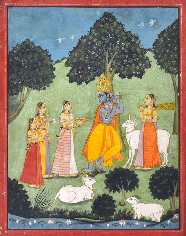 depicting the adoration of Vishnu by five consorts with offerings, in garden setting, natural pigments on paper, unframed, 22.5 x 17.5cm
