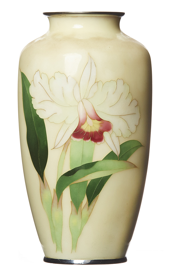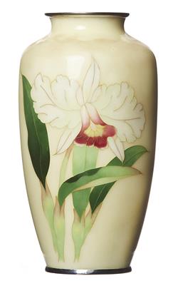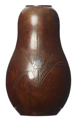 A bronze vase with silver inlaid floral decoration, 25cm high, together with a cloisonné vase with floral decoration, 22cm high.