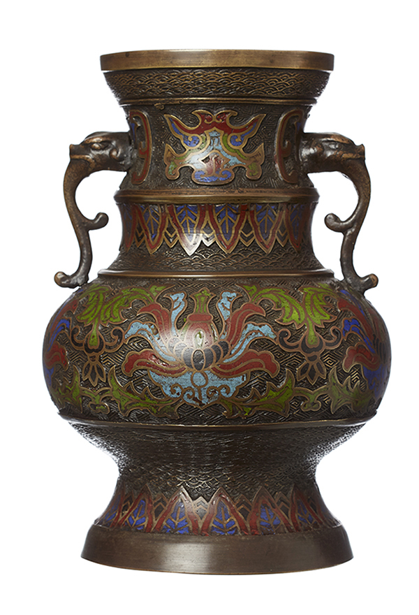 Featuring double elephant form handles and raised enamel decoration of blue, red and green flowers. 25cm high.