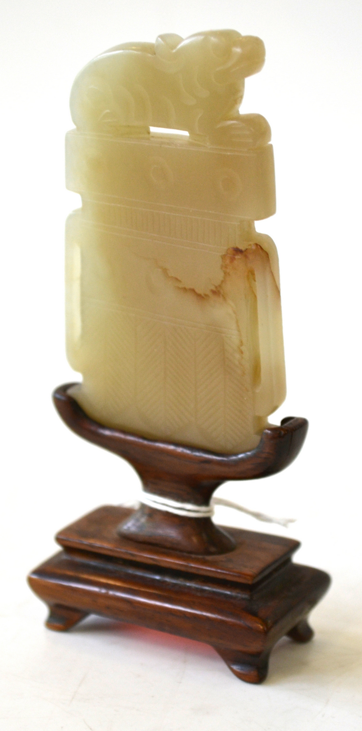 finely carved and surmounted with a long-tailed Foo dog, on original wooden stand, 11.2cm high including stand