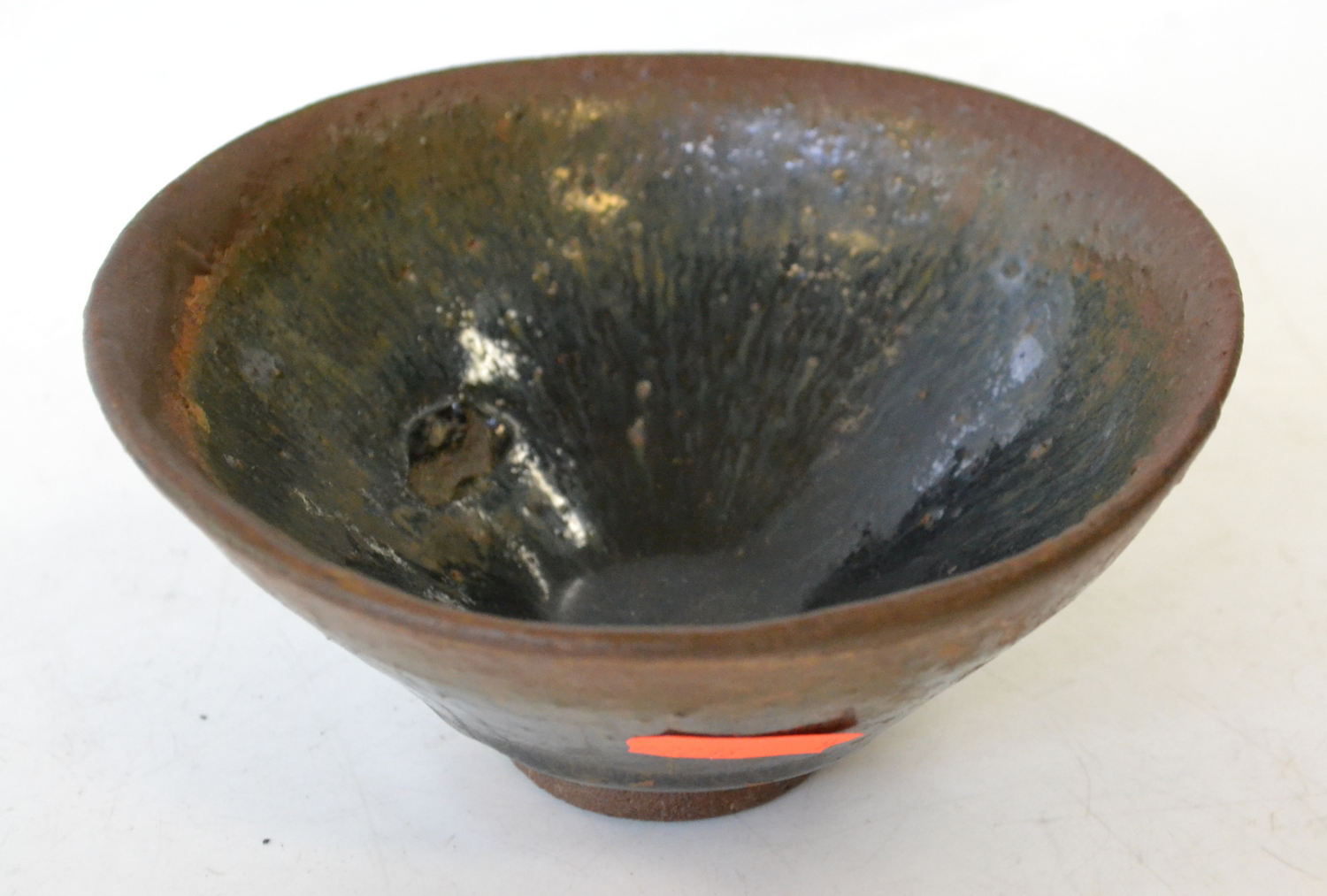 The deep rounded sides rising from a short straight foot to an everted rim, covered overall in a rich, dark lustrous caramel brown-black glaze with russet hare's fur streaks extending from the rim down the interior to the exterior, the glaze falling short of the foot, 6cm high, 12.6cm diameter