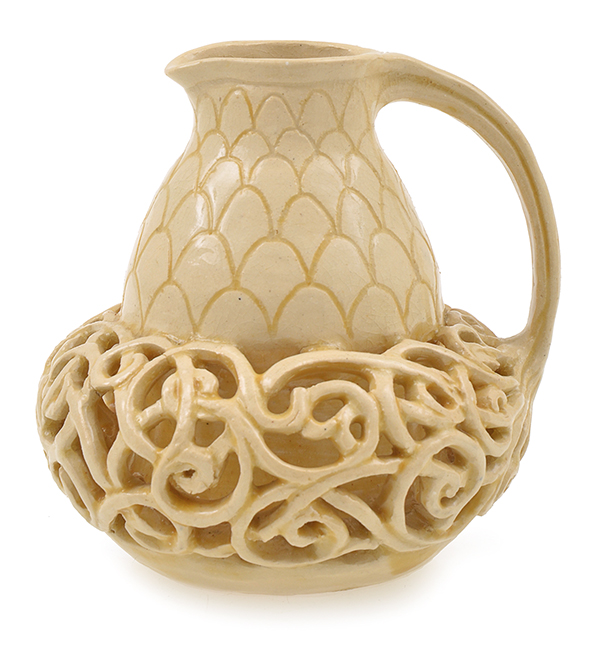 a reticulated, double gourded earthenware jug, pierced to lower body, cream glaze, fluted handle, incised Marguerite Mahood, E1041 to base, 10cm high