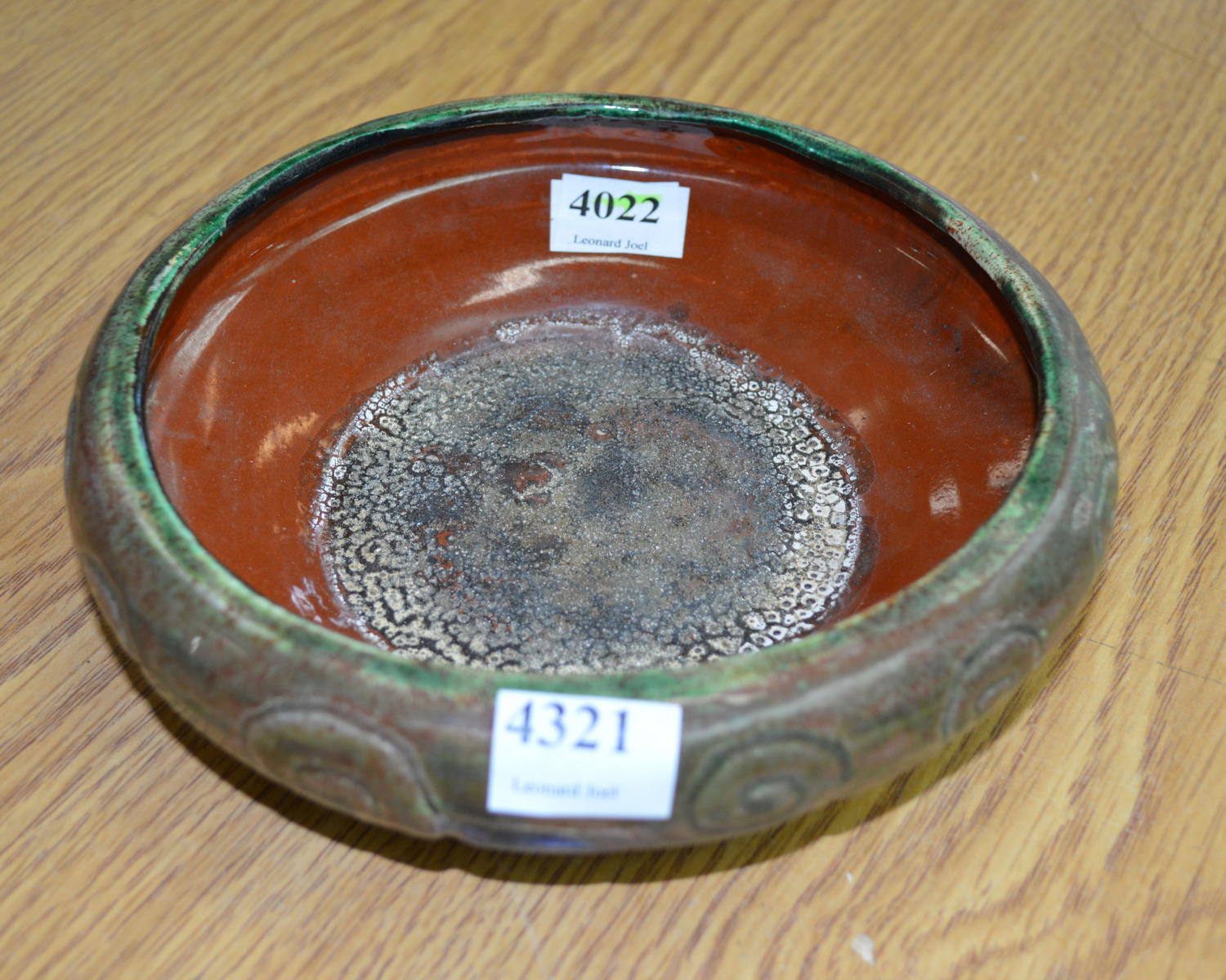 shallow form, incised Art Deco pattern to exterior, multi coloured glaze, incised M. Mahood, B320 to base, 17.5cm diameter