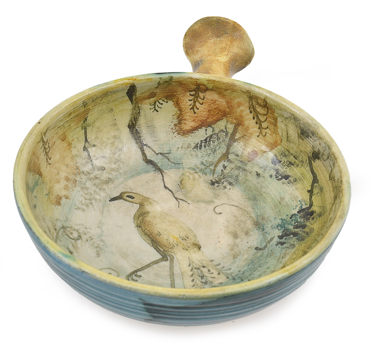 glazed earthenware dish hand painted with lyre bird and tree motif, incised AMB to base, 12cm diameter
