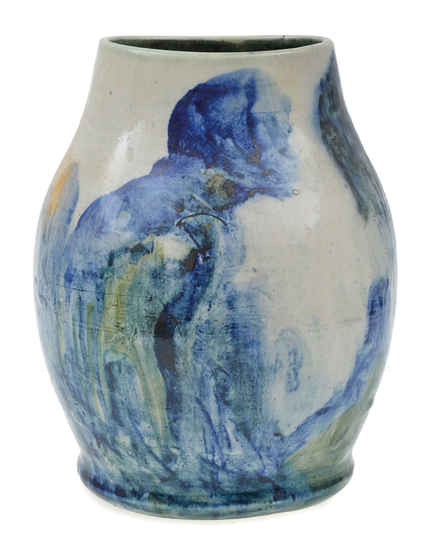 tapering cylindrical formed vase painted with a continuous, stylised landscape, incised Merric Boyd 1932 to base, Doris Boyd, 24.5cm high