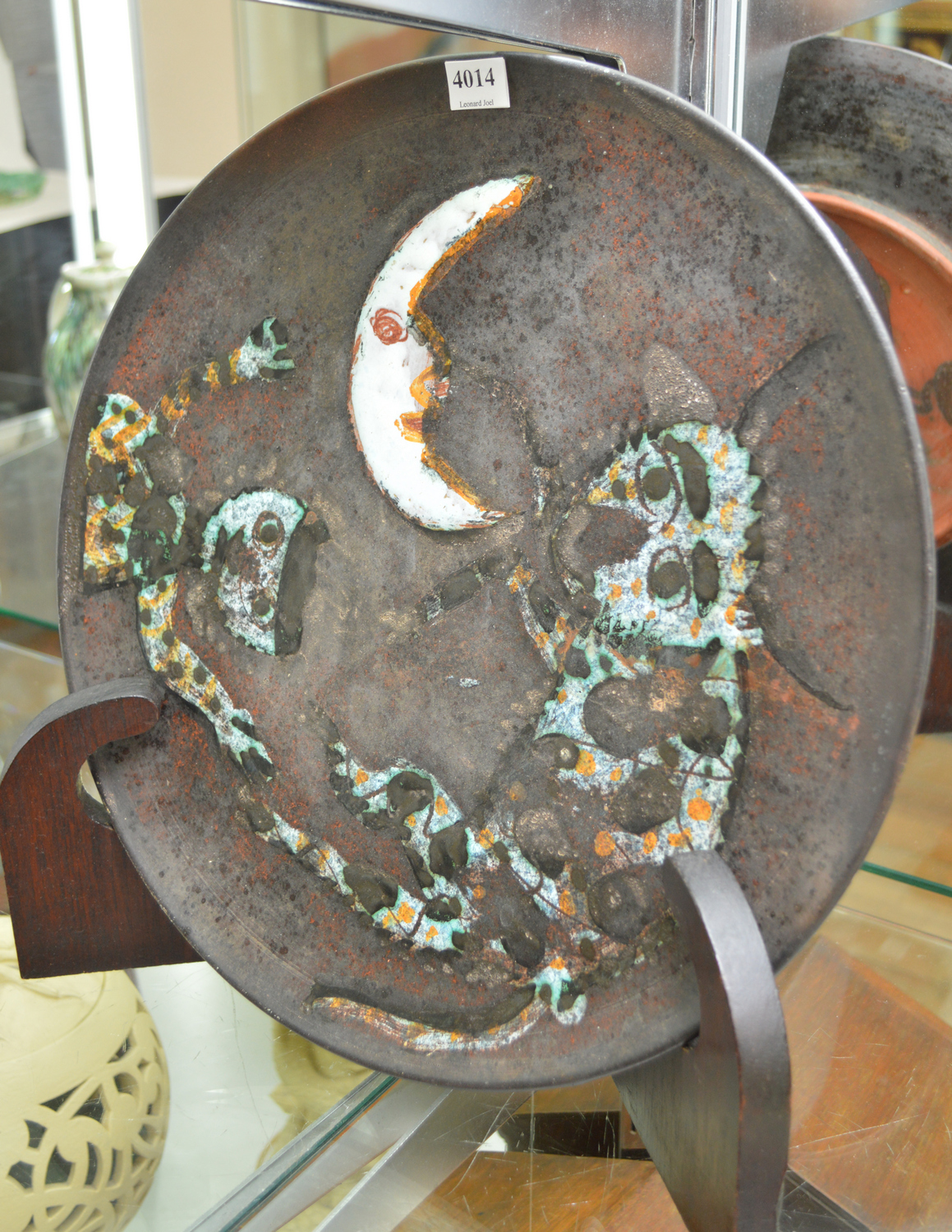 decorated with enamelled cat, cow and moon motifs, inscribed 1956, Perceval, AMB to base, 37.8cm diameter