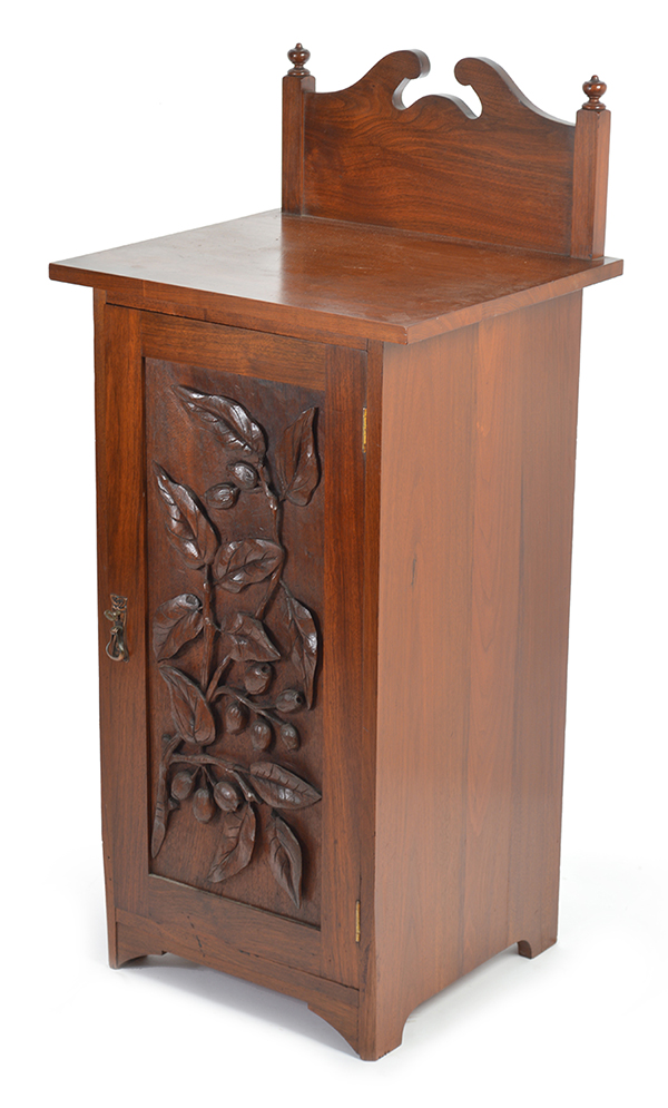 with a rectangular door and a shaped splashback, above a single door carved with gum nuts and leaves, 52 x 114 x 45.5cm