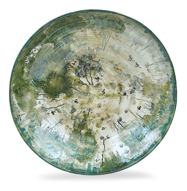 circular earthenware bowl depicting an Australian bush landscape with kangaroos, painted in tones of blue, green and brown, incised AM Boyd Pottery, 1951, Neil Douglas, Perceval to base, 41.8cm diameter