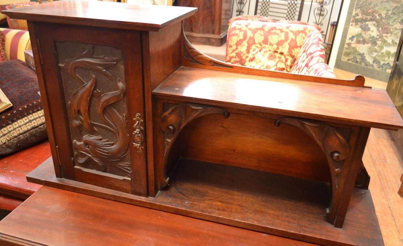 with a single door carved with a gryphon motif, flanked by an open shelf, 104.5 x 52.5 x 26.5cm