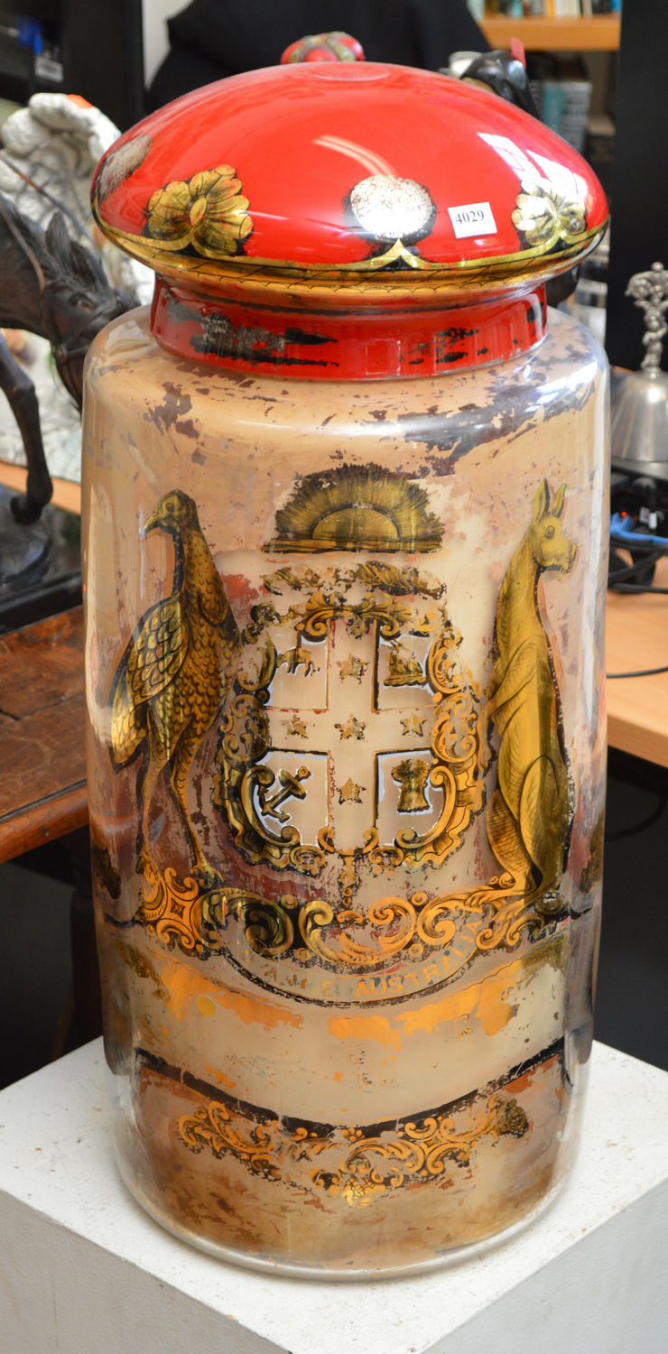 cylindrical in form with a domed cover, with a reserve painted Australian crest, approx. 71cm high