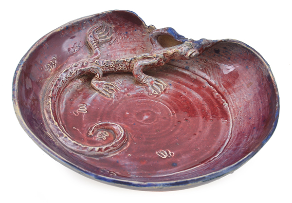 decorated with an applied lizard on purple ground, incised Marguerite Mahood, F1215 to base, 15cm diameter