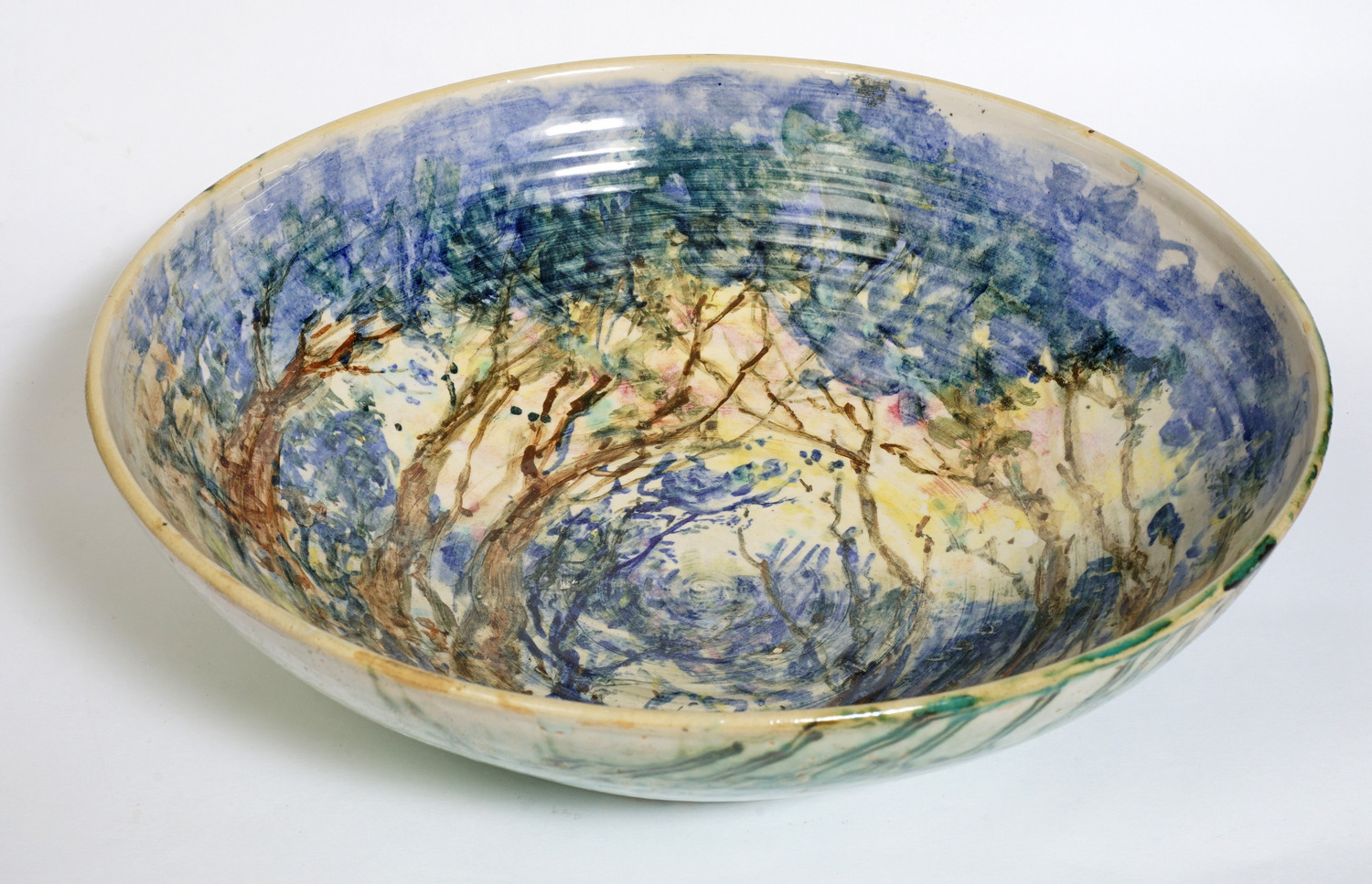 circular earthenware bowl painted with a colourful stylised landscape scene, incised Arthur Merric Boyd to base, Perceval, 34cm diameter