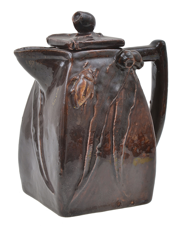 angular shaped earthenware teapot with gumnut and leaves decoration, gumnut finial, all over brown glaze, incised S, /93 to base,18cm high