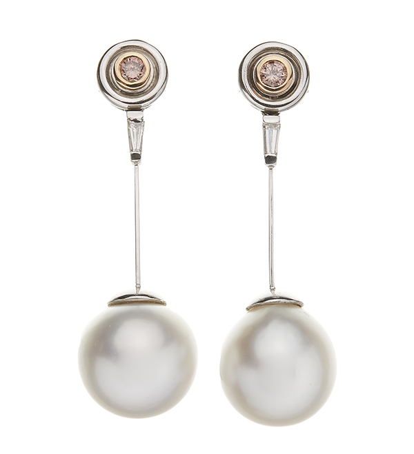 A PAIR OF SOUTH SEA PEARL AND COLOURED DIAMOND EARRINGS