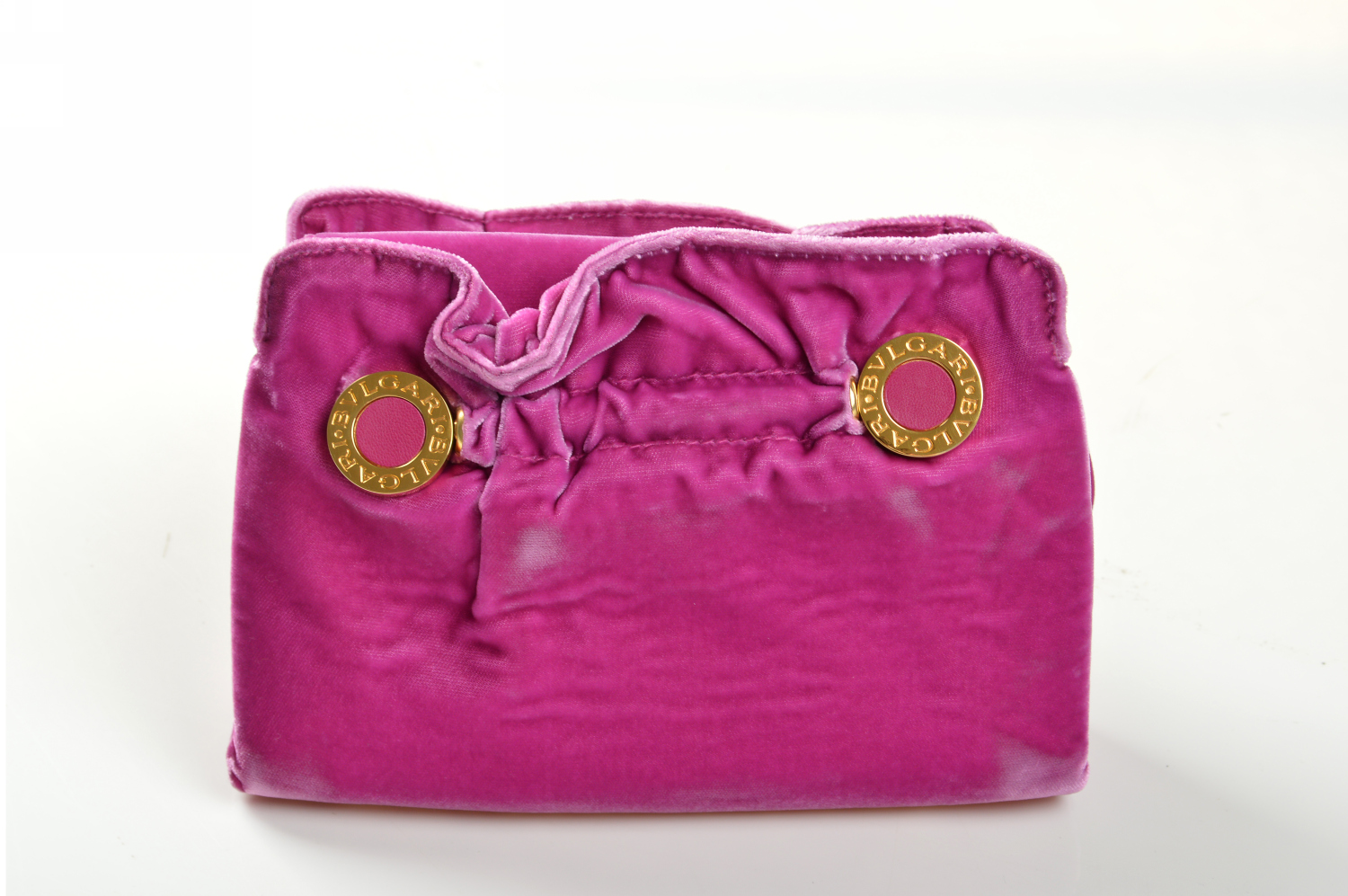Styled in pink velvet with gold metal hardware, 21 x 13 x 6cm.