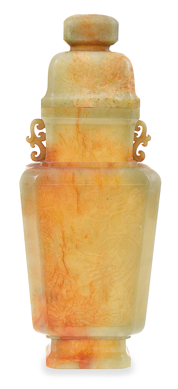 of octagonal section, the front and back panels finely incised with a dragon chasing a pearl design and a scrolling cloud motif, with an archaic-style inscription to the other two sides. An incised square seal to the neck at the front, with a further incised circular seal to the back, with a pair of scrolling handles to the body, the celadon stone is translucent with russet tones, 28cm high