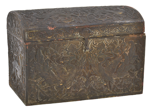 The box depicting the double phoenix fenghuang, with widely outstretched wings forming a triangular pattern, set amongst meandering lotus tendrils to the front panel. The front of the chest has an applied clasp, the back with two hinges.