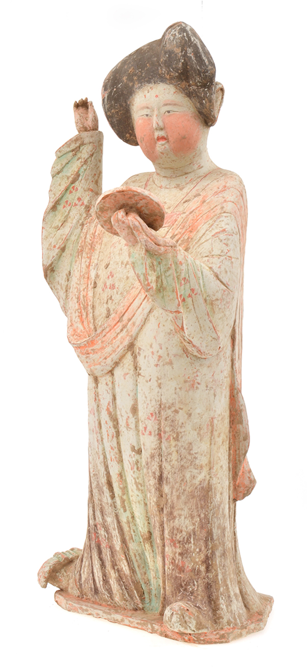 Catalogue Note: As with other pottery court ladies of this type, this plump beauty, was modelled on the 'ideal' of the day, and is a reflection of the fashion of the court during the middle of the 8th Century beginning in the reign of Xuanzong, due largely to the physical attributes of the infamous and romantic Imperial Concubine Yang Guifei (719-756), who the Emperor fell in love with after he saw her emerge from the hotspring baths in a transparent gauze robe and whose beauty was considered so great, she was responsible for toppling an empire.