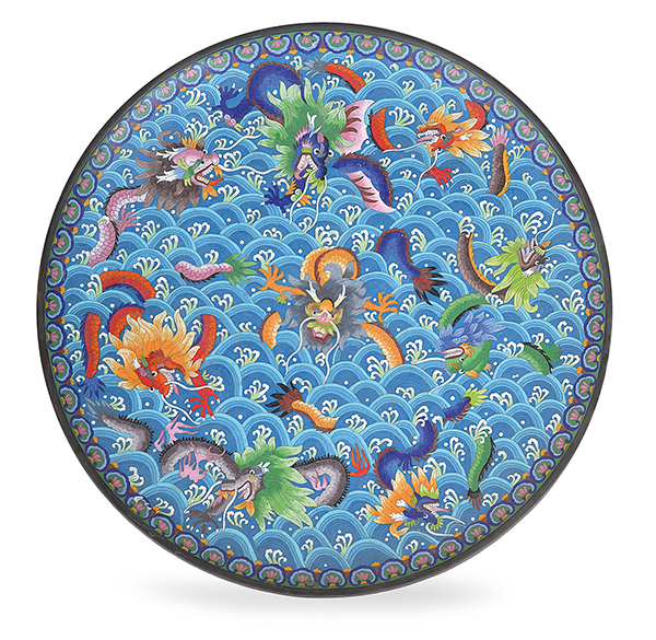 Decorated with vibrant 'doucai' enamels to the interior of the plate and depicting the auspicious nine dragons. A principle imperial five-clawed yellow dragon is surrounded by another eight multi-coloured dragons chasing one another through scrolling waves in tones of blue with white and green sprays. Surrounded by a vivid ruyi-patterned border. The reverse of the charger with incised design and covered in a lovely turquoise enamel