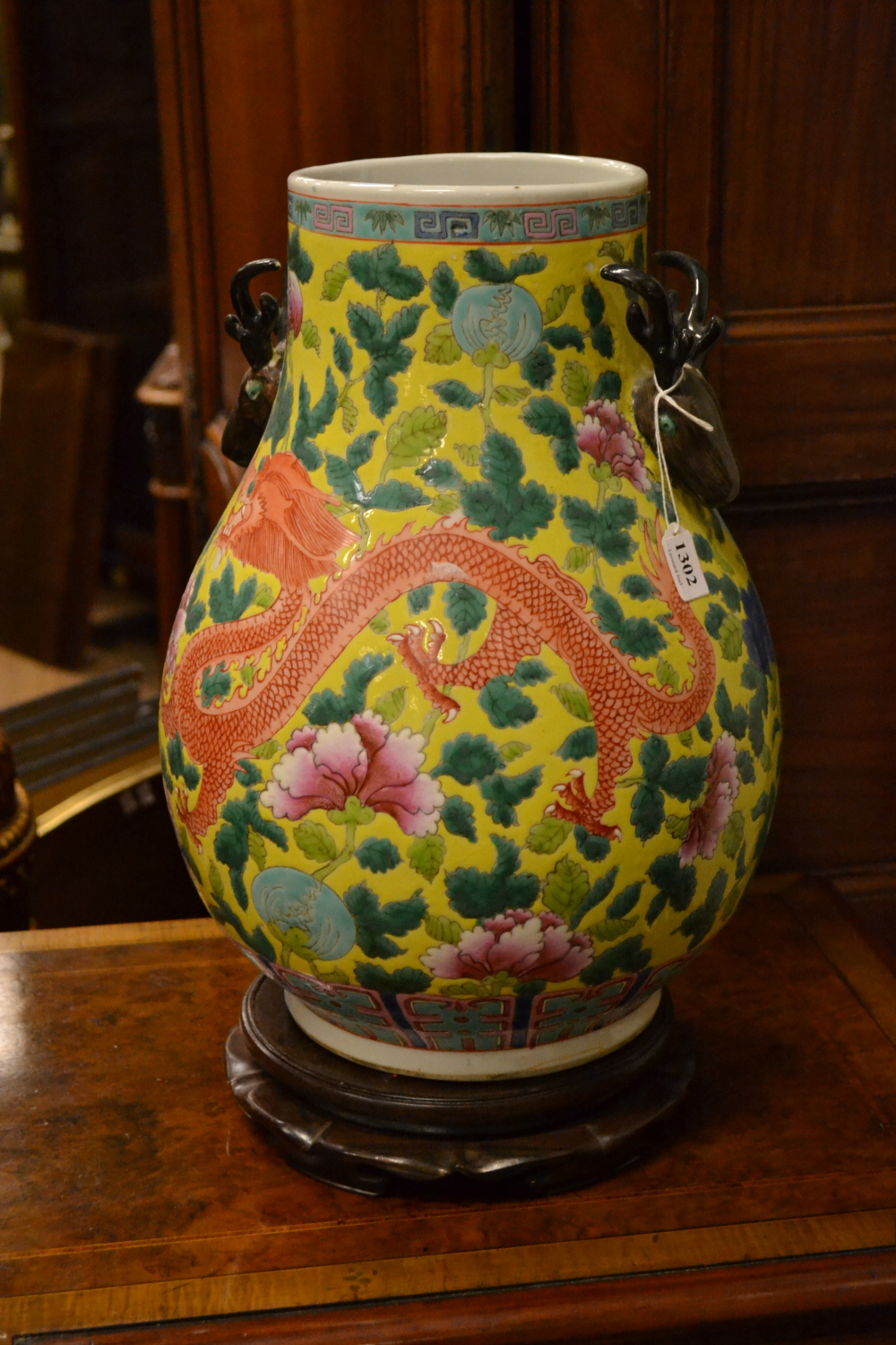of bulbous form with a diaper border, decorated with a large iron red dragon on a yellow reserve, flanked by deer head lugs, together with timber stands, apocryphal Tongzhi mark, 37 cm high