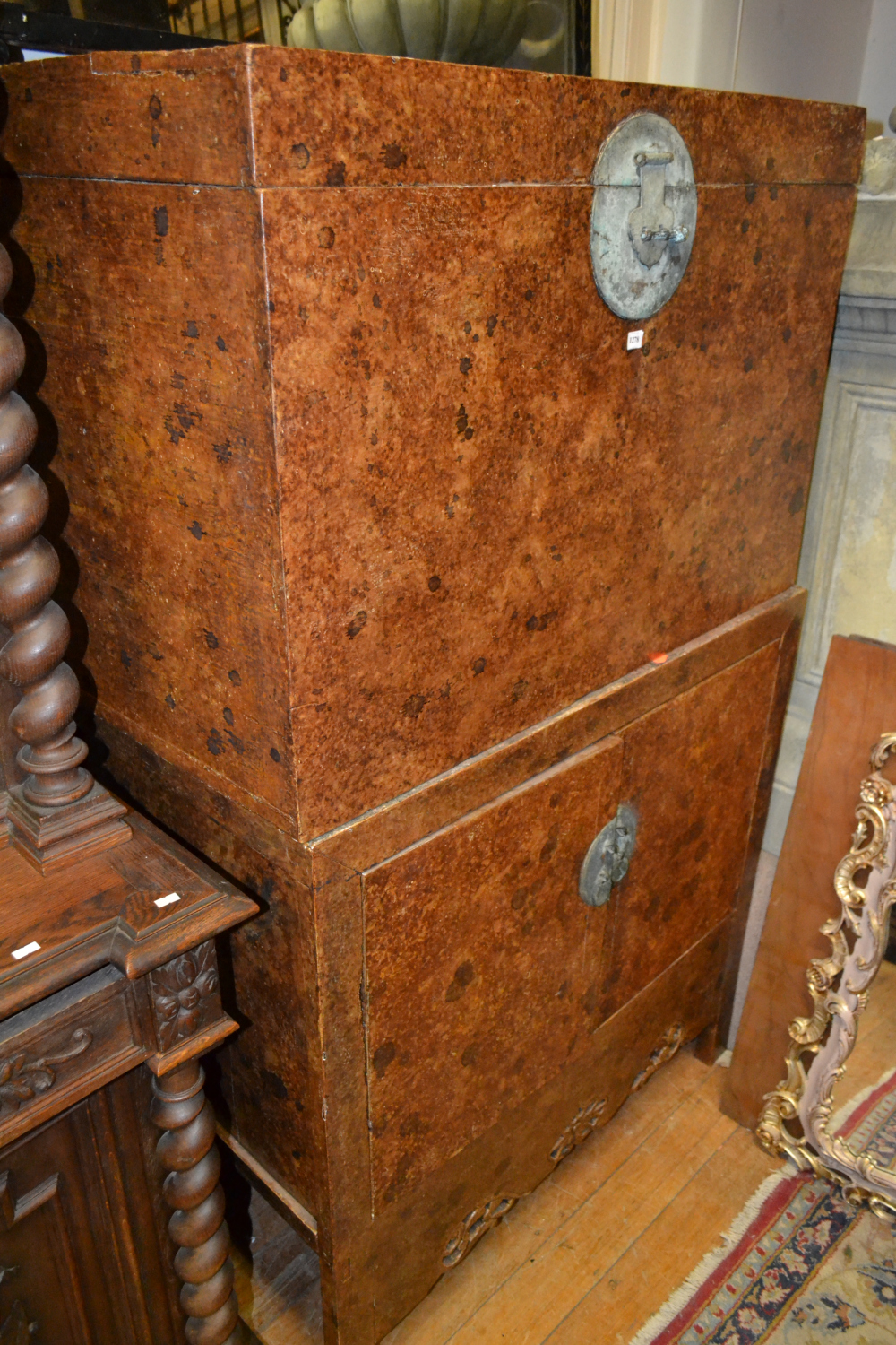 two sectional, the top section with a hinged lid above two panelled doors, the whole with a mottled brown finish, 100 x 168 x 55cm