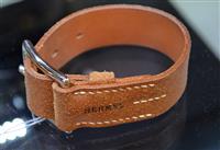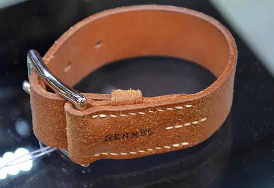 Styled in tan 'cuir a bride' leather, with silver metal buckle, stamped G in a square, total length 28cm.