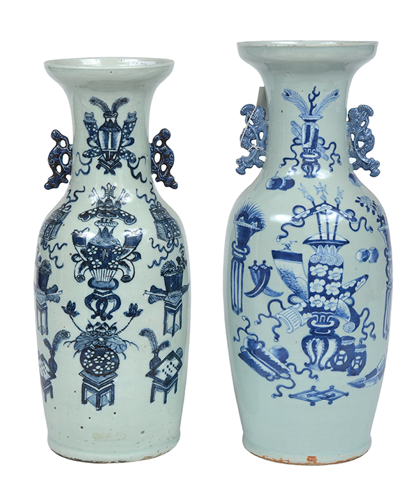 baluster, each with a flared rim and pierced handles, painted with vases and Buddhist symbols, 61cm high and 57.5cm high