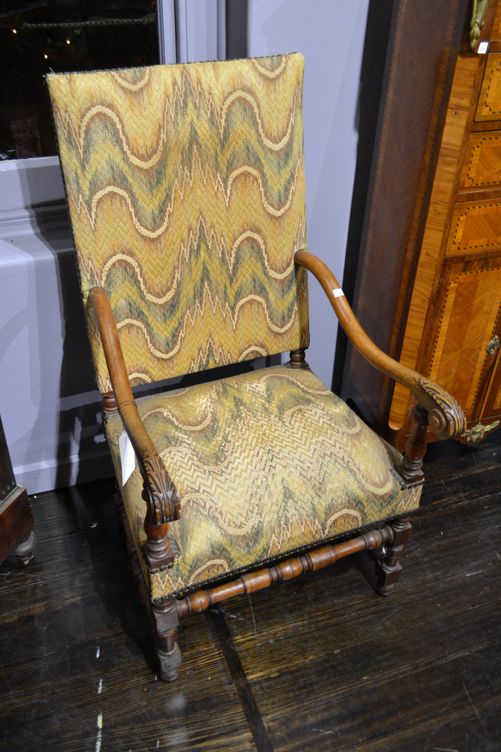 each multicoloured chevron upholstery above leaf capped arms and turned supports united by cross stretchers