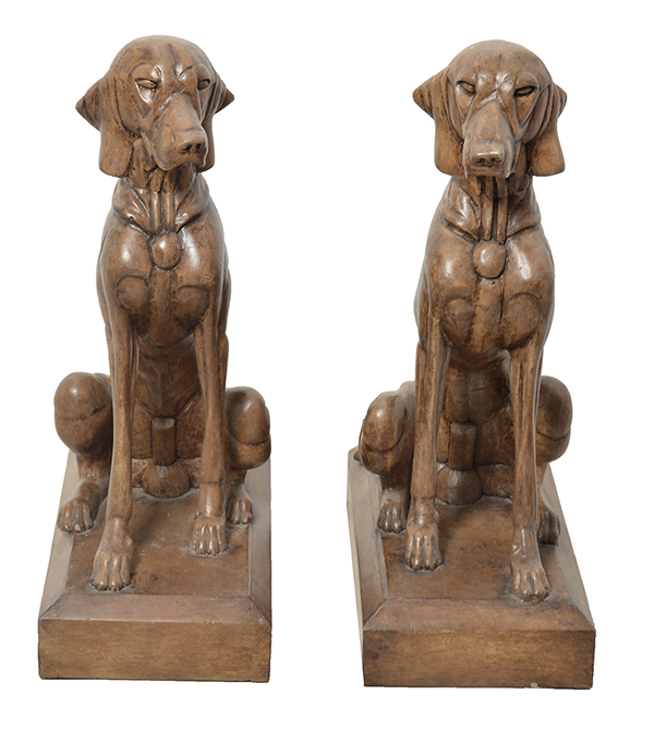 A PAIR OF ARCHITECTURAL CARVED WOODEN FIGURES OF HOUNDS