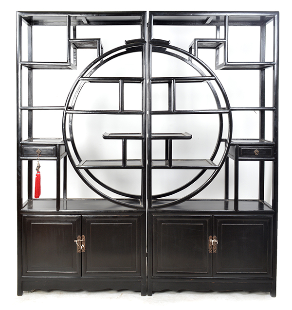 A CHINESE BLACK LACQUERED TWO SECTIONAL OPEN BOOKCASE