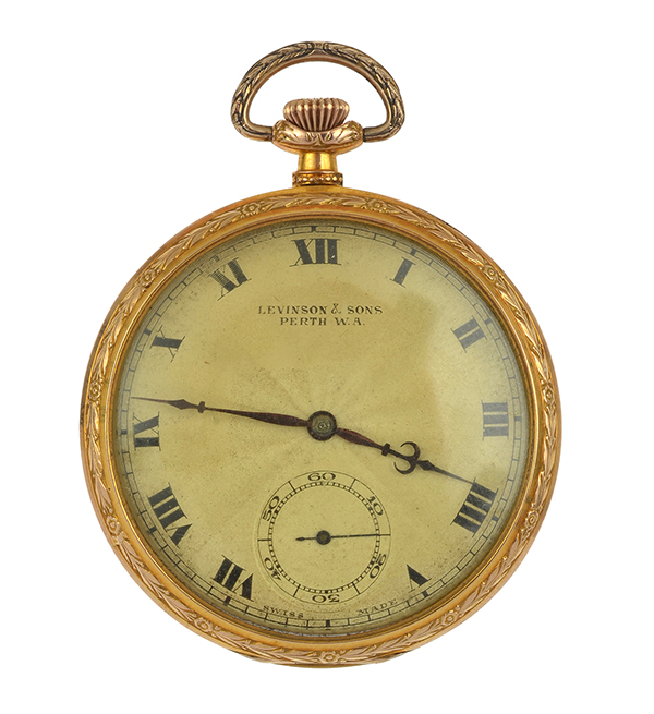 Crown wind and set movement, circular silvered dial with black Roman numerals, subsidiary seconds dial at six, signed case and movement, to a 9ct gold etched and polished case, retailed by Levison & son W.A, 43mm diameter.