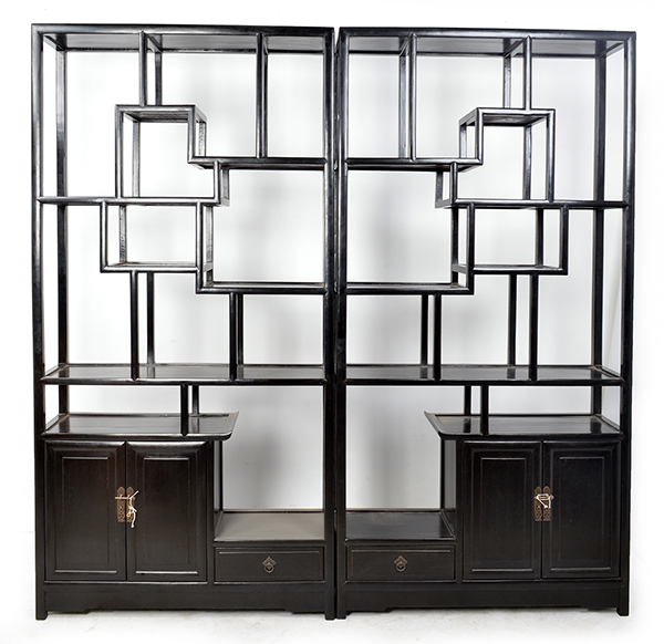 in two sections, the openwork body with multiple shelves, four cupboard doors and two shelves, 100 x 200 x 33cm