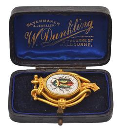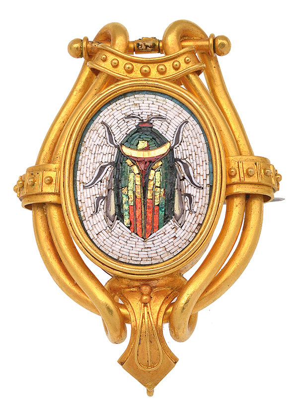 The finely crafted mosaic depicting a scarab, set in a fluted gold frame with bead detail, having a glazed section to the reverse, attributed to Castelani, mounted in 18ct gold.