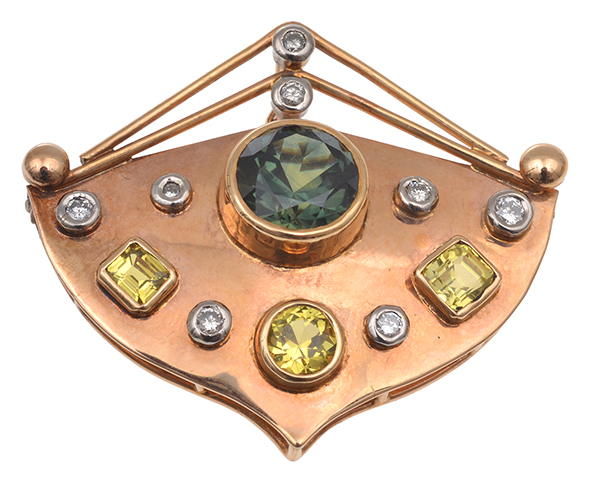 Centrally set with a round green sapphire and having three yellow sapphires and diamond detail below, mounted in a cartouche shaped frame in rose gold, signed.