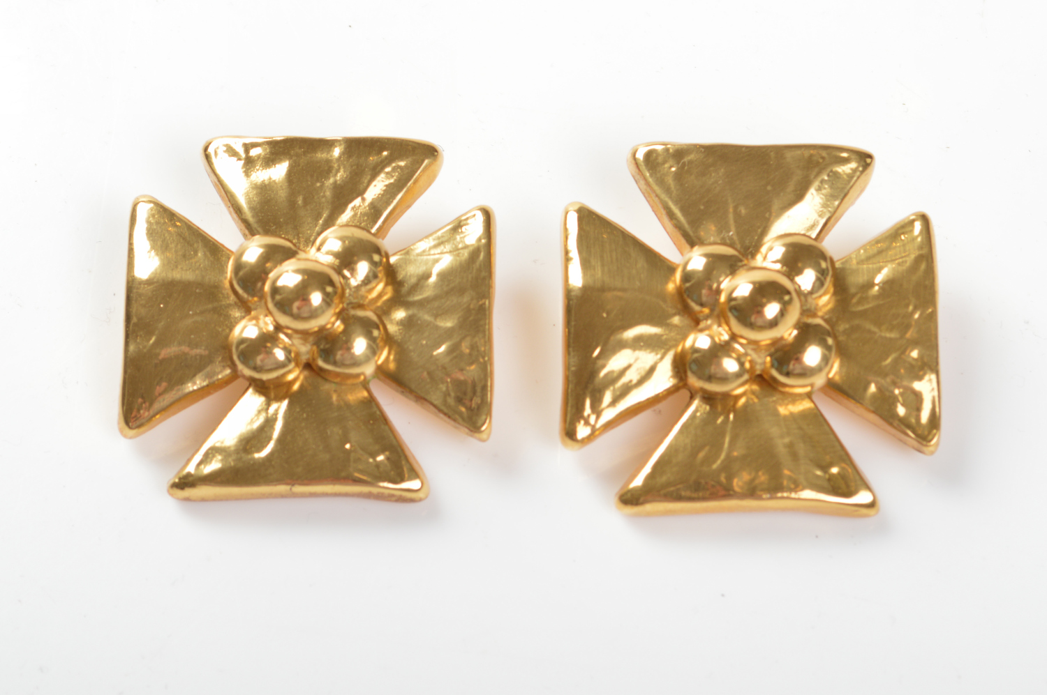 The clip on earrings styled as a Maltese cross in gold metal, with box.