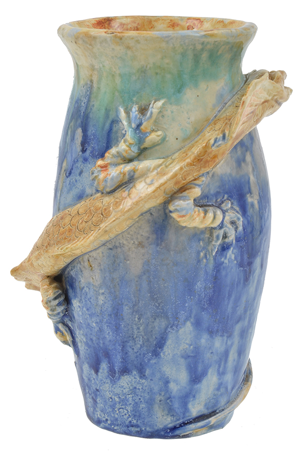 hand-modelled with applied decoration of a twining dragon, coloured drip and blue mottled glaze, incised Castle-Harris to base, 24cm high