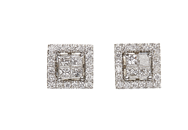 Each stylised square earring invisibly set with four princess cut diamonds, surround by round brilliant cut diamonds totalling 0.48cts, mounted in 18ct white gold.