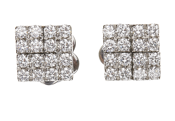 Each stylised square earring set with sixteen round brilliant cut diamonds, mounted in 18ct white gold.