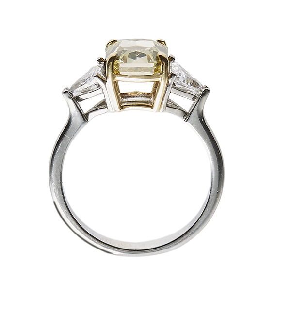 The radiant cut fancy yellow diamond of 2.23cts, flanked by trilliant cut diamond set shoulders, mounted in 14ct white gold, ring size N, accompanied by a GIA certificate stating colour fancy deep brownish, greenish, yellow, clarity SI2.