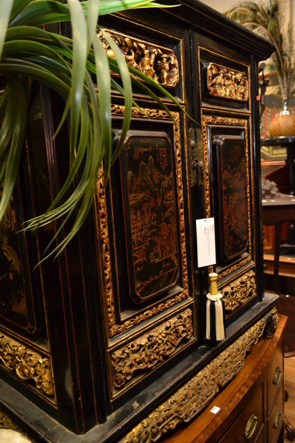 raised on a decorative pedestal base, with two front panels, each with an inner cartouche, depicting the continuation of a gilded mountainous landscape and river scene with figures and pavilions, with an inscription to both, reflecting on the time of the season, with "the flowers not yet fully in bloom, and the moon not yet at its fullest". Framed by a pierced gilt floral border, and surmounted either side by two separate horizontal panels in high relief showing daily life under rich foliage. A separate fine gilt border highlights each section. With detailed brass hinges and latch to the front. With unusual scenes to the sides, one showing a man dressed as a deer begging for his life, from a group of men holding swords and arrows, the other side similarly, showing another man begging for his life from an audience, with the emperor holding court, supported on four short legs,