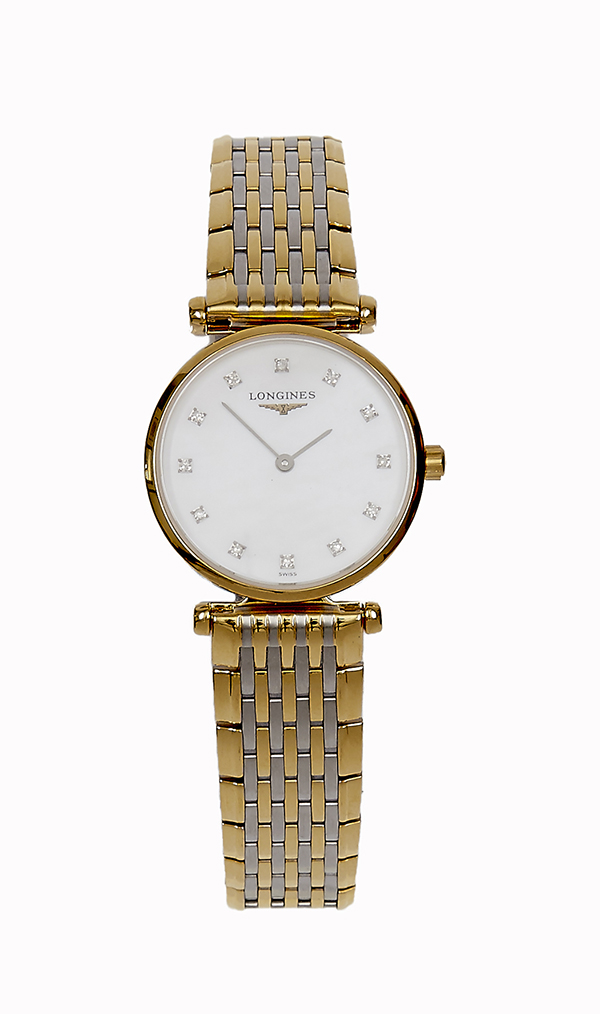 Quartz movement, circular mother of pearl dial with diamond numerals, signed case, dial and movement, gold plated stainless steel case and conforming bands, 25mm diameter, accompanied by Longines box and papers.