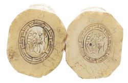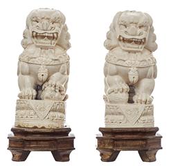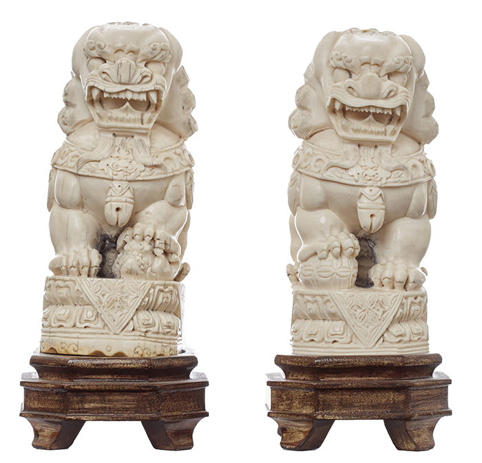Finely carved featuring baring teeth and raised paw, positioned on timber stands. 15.5cm high.