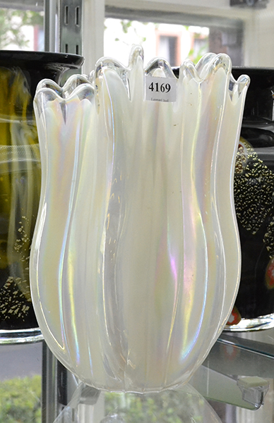 A COLLECTION OF THREE ART GLASS VASES, VARIOUS DESIGNS AND COLOURS INCLUDING MILK GLASS