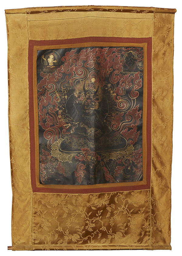 Depicting Mahakala seated in the centre surrounded by red flames and deity figures. 36 x 46cm.